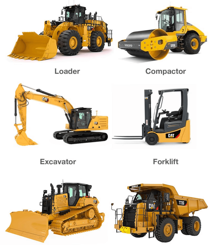 Excavators, bulldozers, graders, loaders,Roller and more.